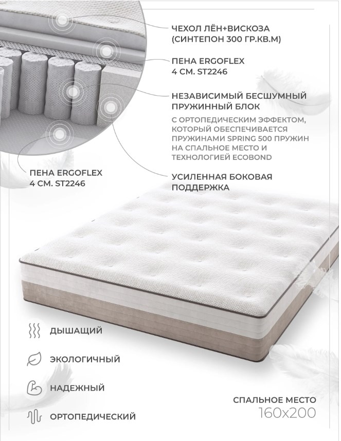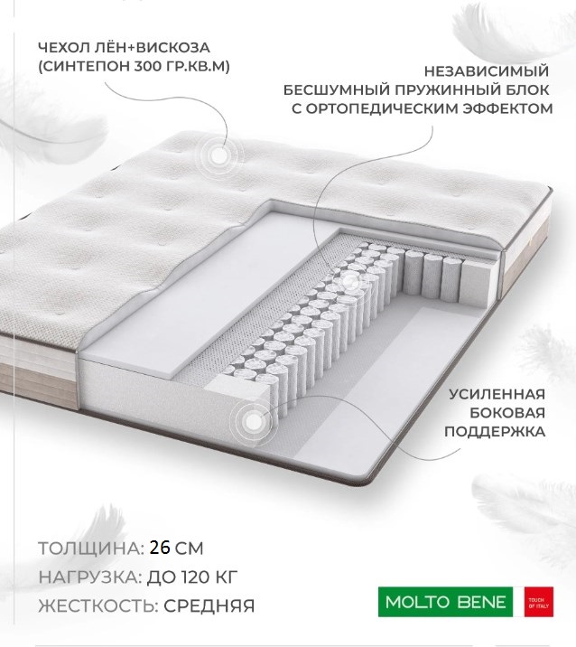Матрас Акура Найт разработан компаний Luxury mattresses и фабрикой MoltoBene для тех кто ценит комфорт, качество и своё здоровье. Это ортопедический матрас в основе которого сочетаются технологии и лучшие материалы. Независимый, бесшумный пружинный блок с ортопедическим эффектом, который обеспечивается пружинами Spring 500 пружин на спальное место и технологией Ecobond (Пружины дополнительно армированы с двух сторон). Где каждая пружина защищена и упакована отдельно от других в специальный чехол. Что обеспечивает тишину и надежность при пользовании матрасом. Высокоэластичная пена Ergoflex на водной основе, имеет среднюю жёсткость, не деформируется со временем. Обеспечивает 100% циркуляцию воздуха за счёт открытой молекулярной структуры, позволяет поддерживать идеальную температуру спального места, отводить лишнюю влагу и запахи. Усиленная боковая поддержка обеспечивает упругость краев матраса и не даёт пружинному блоку деформироваться внутри. И все это под мягким, экологичным и комфортным чехлом в составе которого лён + вискоза простеганный на синтепоне 300 гр. кв. м. Вы ощутите мягкость и комфорт подобный облаку!