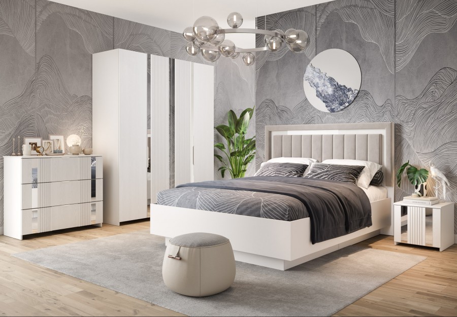 Отличительной чертой коллекции «Харди» являются вставки из МДФ облицованные плёнкой ПВХ, которые прикреплены на фасадах тумбы, комода, шкафа и лицевой части кровати. Двери шкафов и видимые части изделий обработаны кромочной лентой ПВХ толщиной 2 мм с радиусным закруглением и не имеют острых углов. На фасадной части изделий зеркальные вставки.
